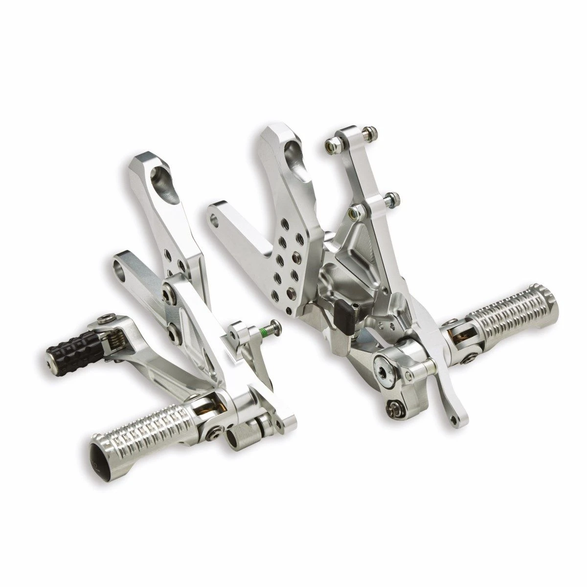 Ontwikkeld dankzij de ervaring van Ducati Corse en de bekwame productieve zorg van Rizoma. Gemaakt van een hoogwaardige geanodiseerde aluminiumlegering die na verloop van tijd zijn oorspronkelijke uiterlijk behoudt. Ze zijn in vijf posities verstelbaar en stellen de rijder in staat de positie te vinden die het beste bij hun lichaamsbouw en rijstijl past. Uitgerust met wegklapbare rem- en schakelpedalen om het risico op breuk bij uitglijden te minimaliseren. Ze gebruiken de standaard DQS, die zowel als traditionele ploeg als als omgekeerde/raceploeg kan worden geconfigureerd. Een essentieel accessoire voor de meest veeleisende rijders die ten volle willen genieten van een ongeëvenaarde rijervaring.