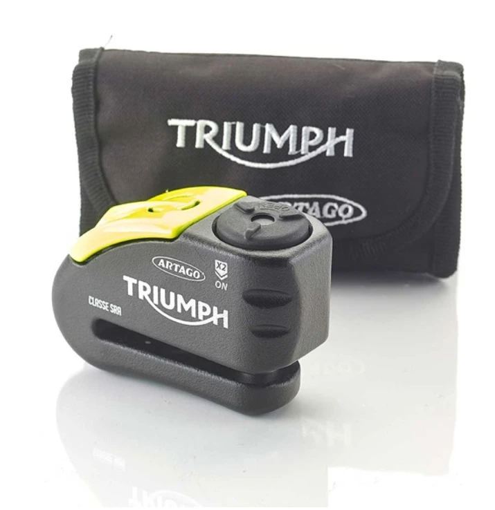 Een alarmschijfslot met Triumph-merknaam, compleet met 120db bewegingsgeactiveerde sirene, anti-pick / boorslot en 14 mm pin. Beschikt over een door de gebruiker vervangbare lithium CR2-batterij. Veilig / SRA gehomologeerd verkocht.